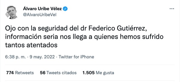 “Ojo con la seguridad del dr Federico Gutiérrez, información seria nos llega a quienes hemos sufrido tantos atentados”, trinó.