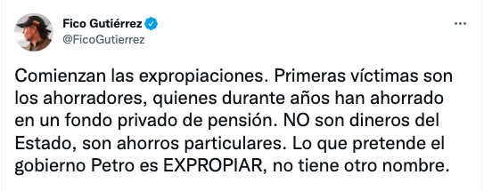 – Fico Gutiérrez: «Comienzan las expropiaciones. Primeras víctimas son los ahorradores, quienes durante años han ahorrado en un fondo privado de pensión. NO son dineros del Estado, son ahorros particulares. Lo que pretende el gobierno Petro es EXPROPIAR, no tiene otro nombre».