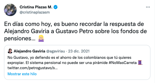 – Cristina Plazas: «En días como hoy, es bueno recordar la respuesta de Alejandro Gaviria a Gustavo Petro sobre los fondos de pensiones»