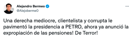 – Alejandro Bermeo: «Una derecha mediocre, clientelista y corrupta le pavimentó la presidencia a PETRO, ahora ya anunció la expropiación de las pensiones! De Terror!».