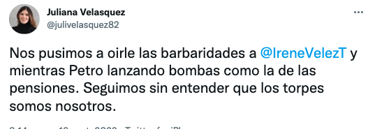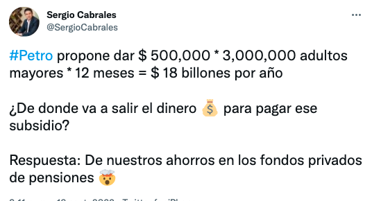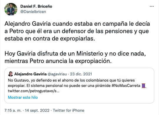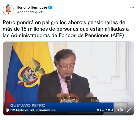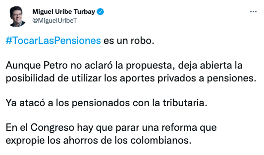 – Miguel Uribe:«#TocarLasPensiones es un robo. Aunque Petro no aclaró la propuesta, deja abierta la posibilidad de utilizar los aportes privados a pensiones. Ya atacó a los pensionados con la tributaria. En el Congreso hay que parar una reforma que expropie los ahorros de los colombianos».– Juliana Velásquez: «Nos pusimos a oírle las barbaridades a @IreneVelezT y mientras Petro lanzando bombas como la de las pensiones. Seguimos sin entender que los torpes somos nosotros».– Sergio Cabrales: «#Petro propone dar $ 500,000 * 3,000,000 adultos mayores * 12 meses = $ 18 billones por año ¿De donde va a salir el dinero para pagar ese subsidio?. Respuesta: De nuestros ahorros en los fondos privados de pensiones».– Honorio Henríquez: «Petro pondrá en peligro los ahorros pensionarles de más de 18 millones de personas que están afiliadas a las Administradoras de Fondos de Pensiones (AFP)».– Daniel Briceño: «Alejandro Gaviria cuando estaba en campaña le decía a Petro que él era un defensor de las pensiones y que estaba en contra de expropiarlas. Hoy Gaviria disfruta de un Ministerio y no dice nada, mientras Petro anuncia la expropiación».