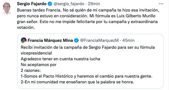 Poco antes Francia Márquez escribió en su cuenta de Twitter: “Recibi invitación de la campaña de Sergio Fajardo para ser su fórmula vicepresidencial. Agradezco tener en cuenta nuestra lucha. No aceptamos por 2 razones: 1-Somos el Pacto Histórico y haremos el cambio para nuestra gente. 2-En mi comunidad me enseñaron que la palabra se honra”.