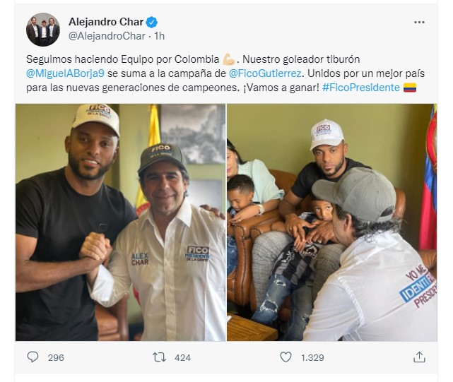 “Seguimos haciendo Equipo por Colombia. Nuestro goleador tiburón Miguel Ángel se suma a la campaña de Fico Gutiérrez. Unidos por un mejor país para las nuevas generaciones de campeones. ¡Vamos a ganar!”, dijo Char en un trino.