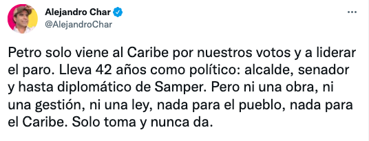 «Petro solo viene al Caribe por nuestros votos y a liderar el paro. Lleva 42 años como político: alcalde, senador y hasta diplomático de Samper», afirmó el exalcalde de Barranquilla.