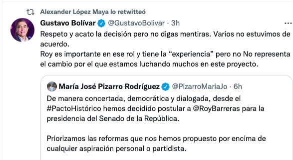 Todo ello tuvo su origen tras un trino de la Senadora electa por esa colectividad, María José Pizarro, hija del entonces líder del M-19 Carlos Pizarro Leongómez, en el que aseguró: “De manera concertada, democrática y dialogada, desde el #PactoHistórico hemos decidido postular a @RoyBarreras para la presidencia del Senado de la República. Priorizamos las reformas que nos hemos propuesto por encima de cualquier aspiración personal o partidista”.