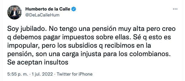 «Soy jubilado. No tengo una pensión muy alta, pero creo que debemos pagar impuestos sobre ellas. Sé que esto es impopular, pero los subsidios q recibimos en la pensión, son una carga injusta para los colombianos. Se aceptan insultos», escribió De la Calle.