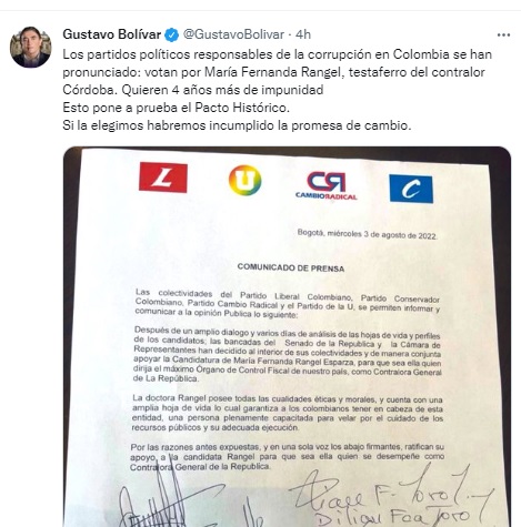 Los partidos políticos responsables de la corrupción en Colombia se han pronunciado: votan por María Fernanda Rangel, testaferro del contralor Córdoba. Quieren 4 años más de impunidad Esto pone a prueba el Pacto Histórico. Si la elegimos habremos incumplido la promesa de cambio», escribió en su cuenta de la red social.