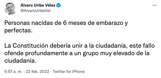 El expresidente de la República, Álvaro Uribe Vélez, se pronunció este martes sobre el fallo de la Corte Constitucional, de despenalizar el aborto hasta la semana 24.