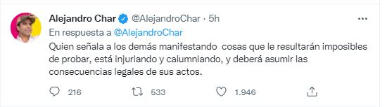 Los precandidatos a la Presidencia de la República, Alejandro Char y Gustavo Petro, sostuvieron este domingo su segundo cruce picante en la red social Twitter.