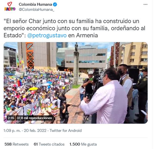 «El señor Char junto con su familia ha construido un emporio económico junto con su familia, ordeñando al Estado», afirmó el líder de la Colombia Humana.