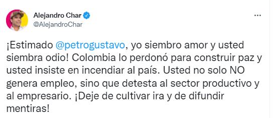 «¡Estimado @petrogustavo, yo siembro amor y usted siembra odio! Colombia lo perdonó para construir paz y usted insiste en incendiar al país», afirmó el exalcalde de Barranquilla.
